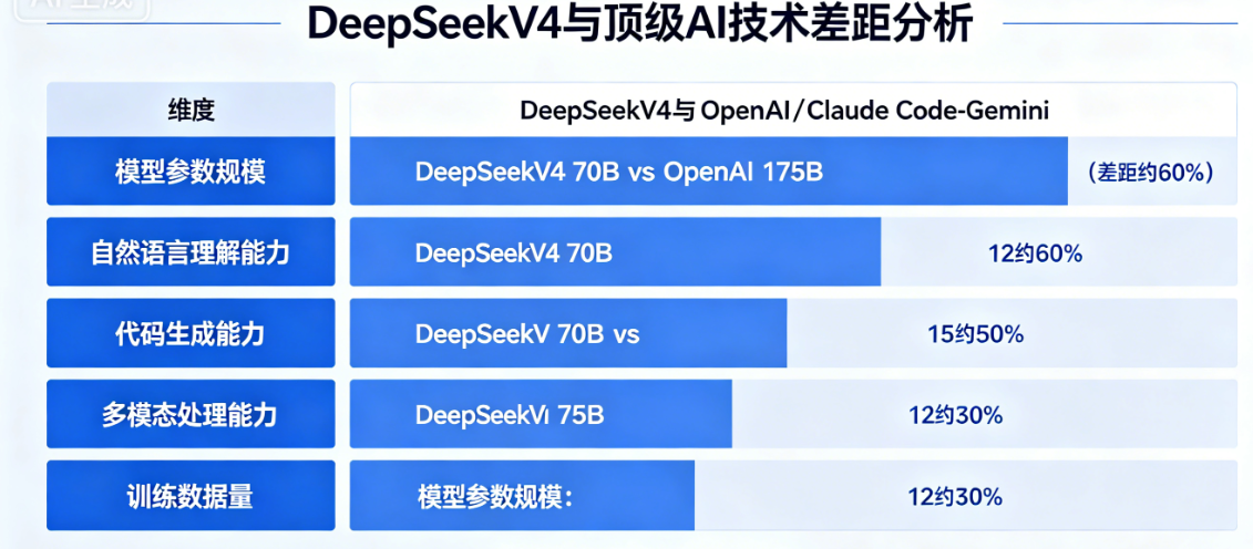 差距极大(8-12 个月),V4 暂无原生视觉能力,而闭源模型已实现图文音视频全模态理解